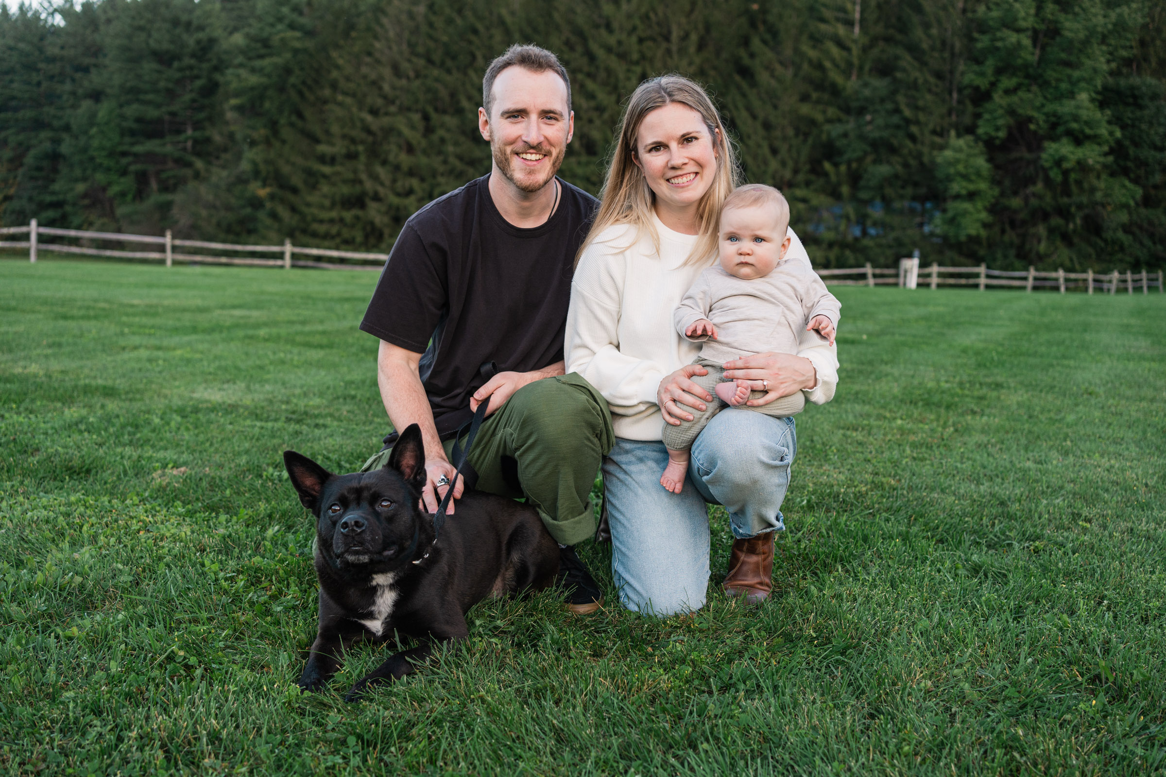 We met on a stunning September evening, the kind I hope to have for every photo session! The leaves were just starting to turn. We made our way around the farm, and toward the end, we included their family dog, Bolt, to join in a few portraits.