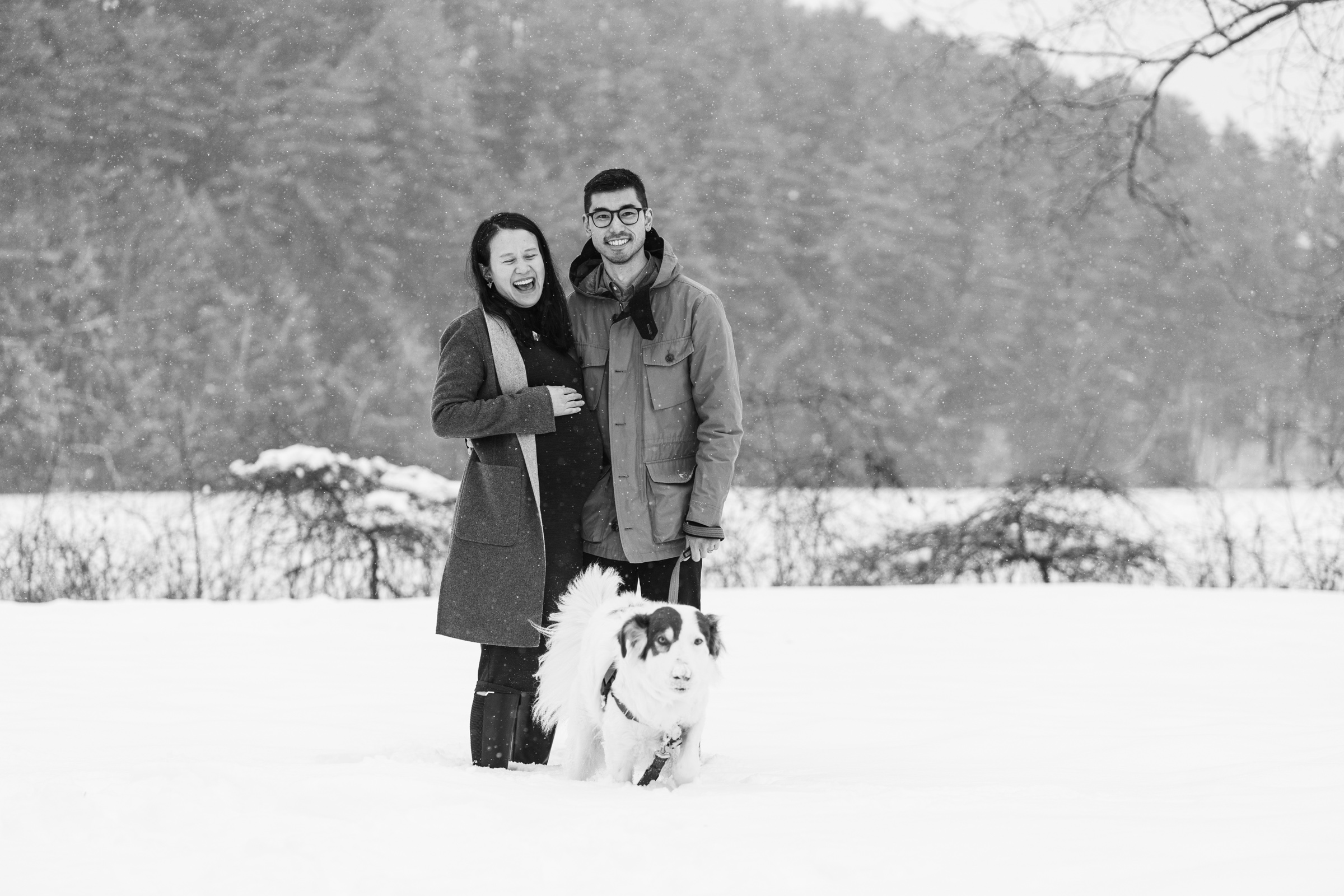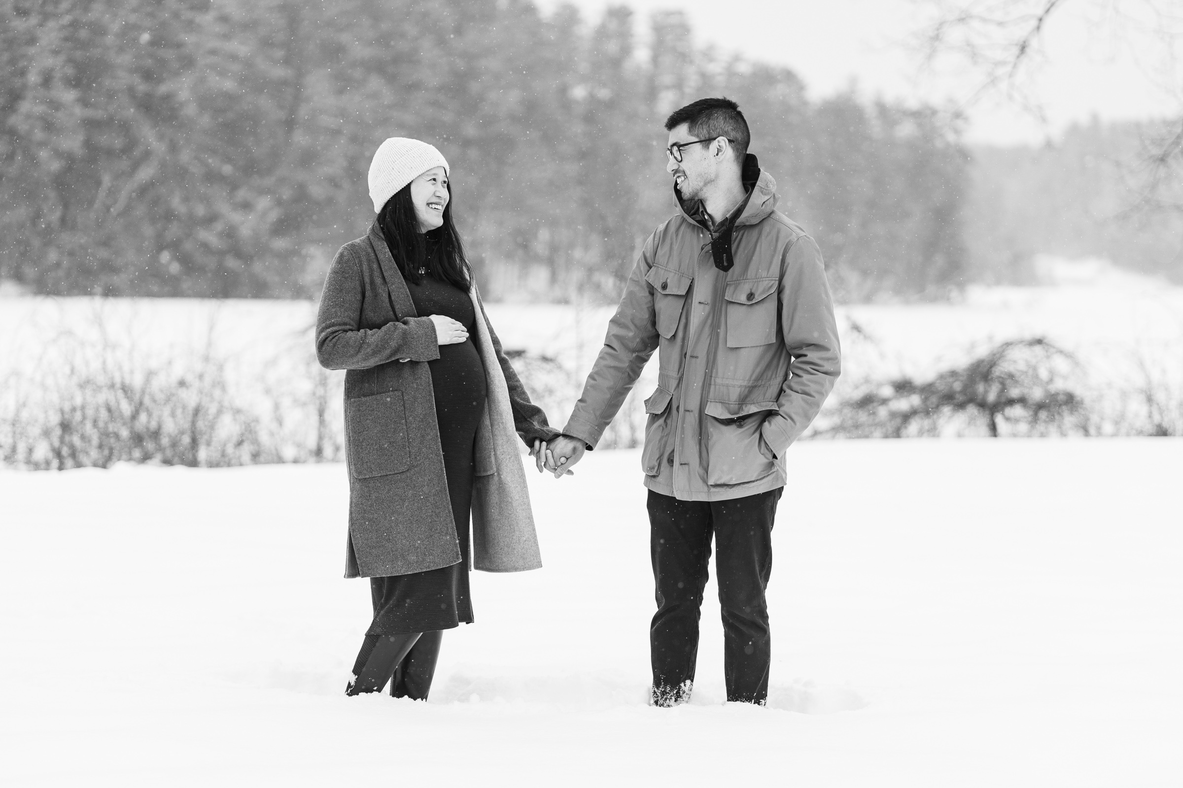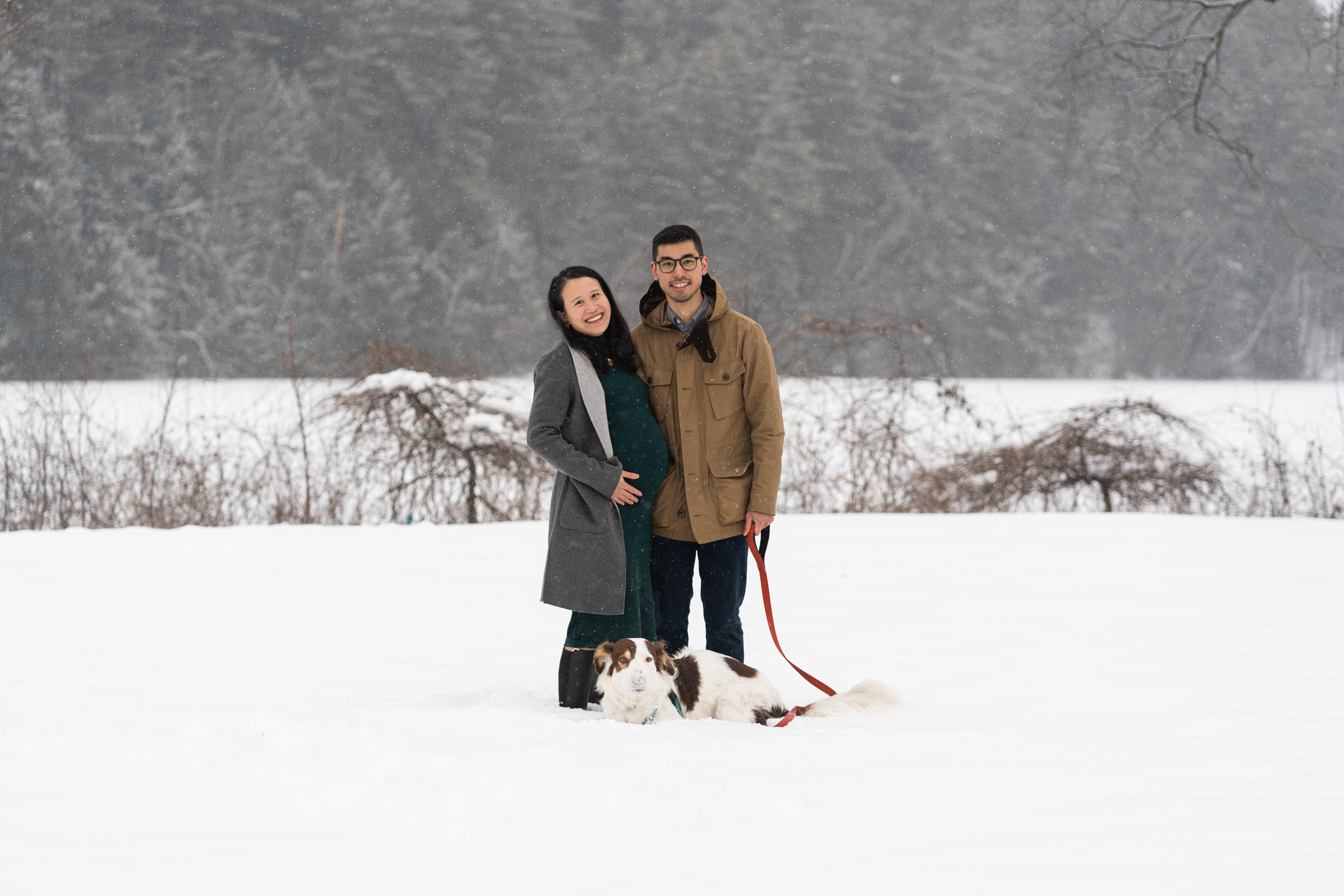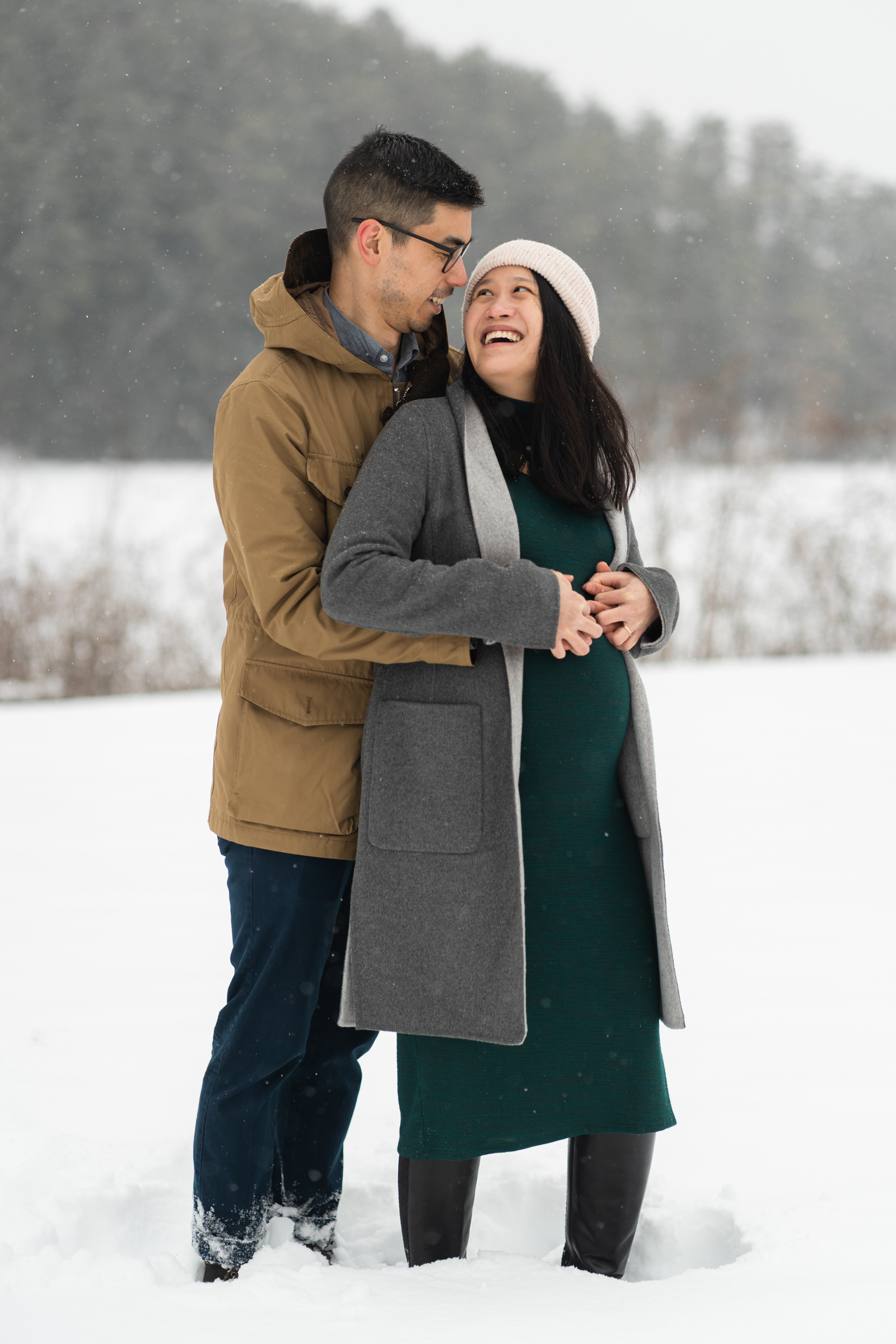 They chose a great style for a winter weather photo session that allowed them to be warm and comfortable by dressing in layers, but also remove jackets for a few photos to show off her maternal shape. Their outfits matched both the season, the New England vibe, and provided enough contrast to stand out agains the white, snowy backdrop.