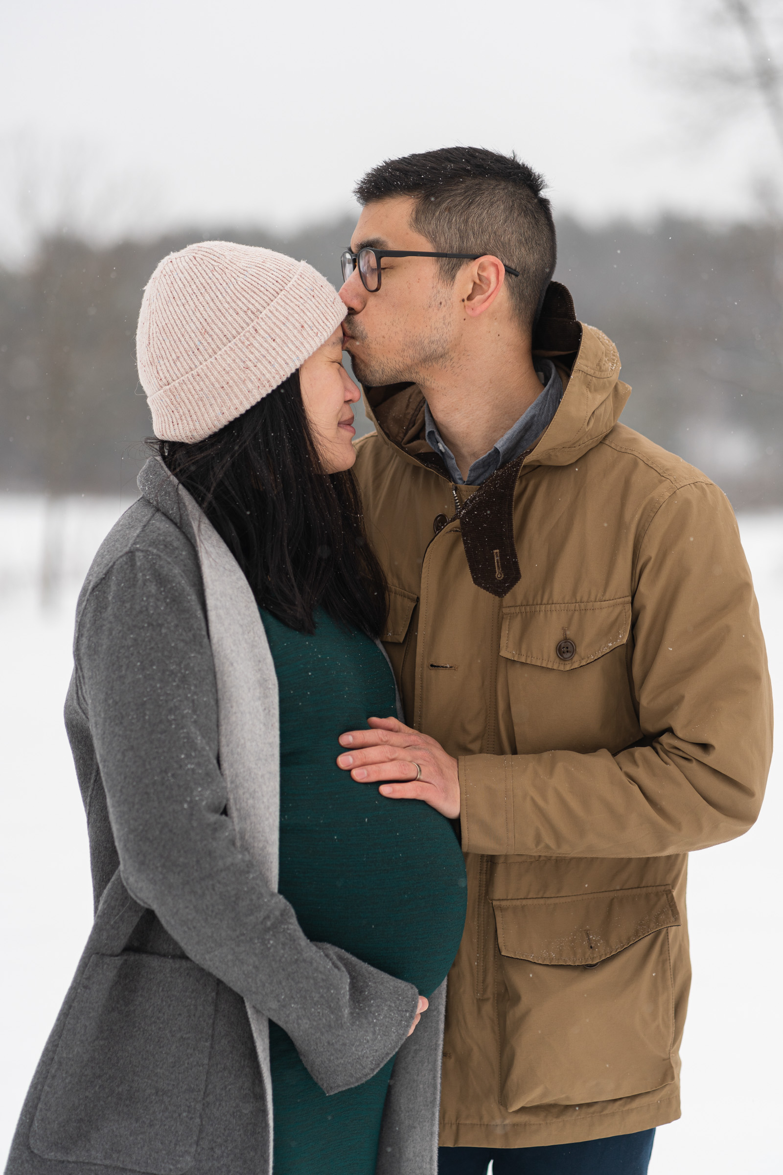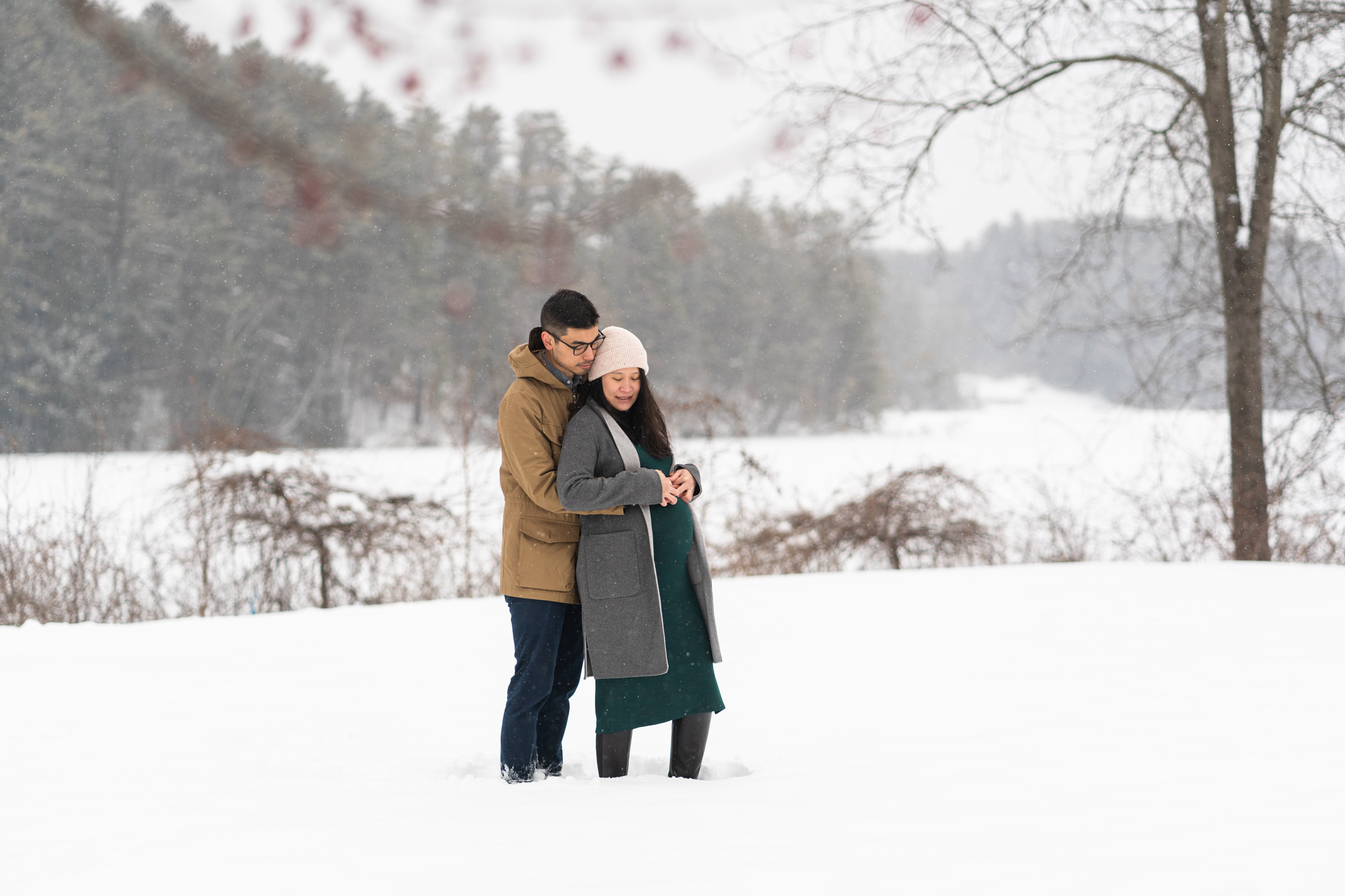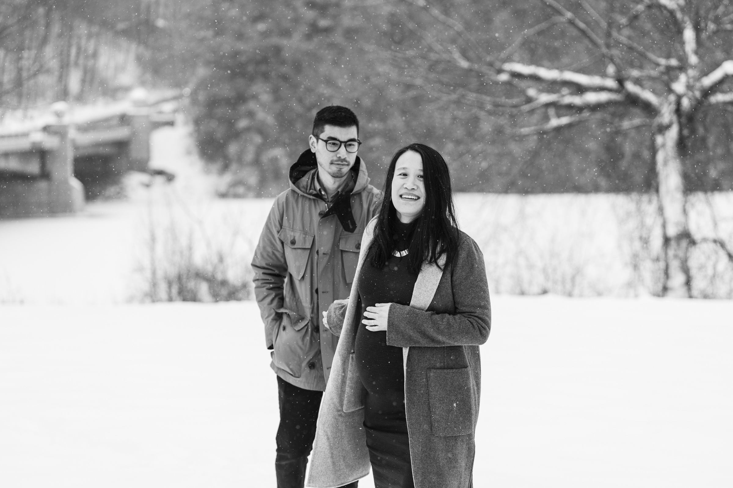 They chose a great style for a winter weather photo session that allowed them to be warm and comfortable by dressing in layers, but also remove jackets for a few photos to show off her maternal shape. Their outfits matched both the season, the New England vibe, and provided enough contrast to stand out agains the white, snowy backdrop.