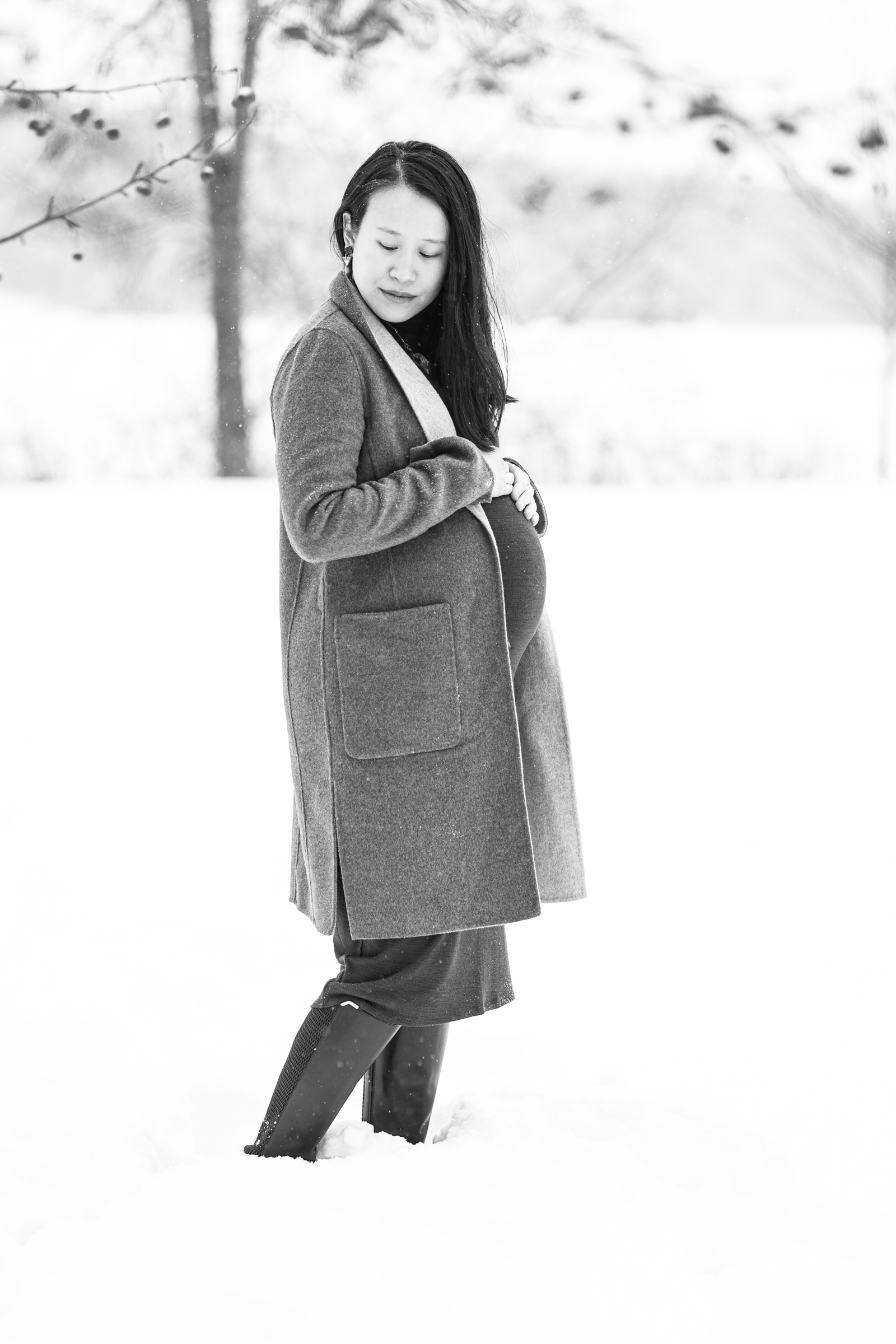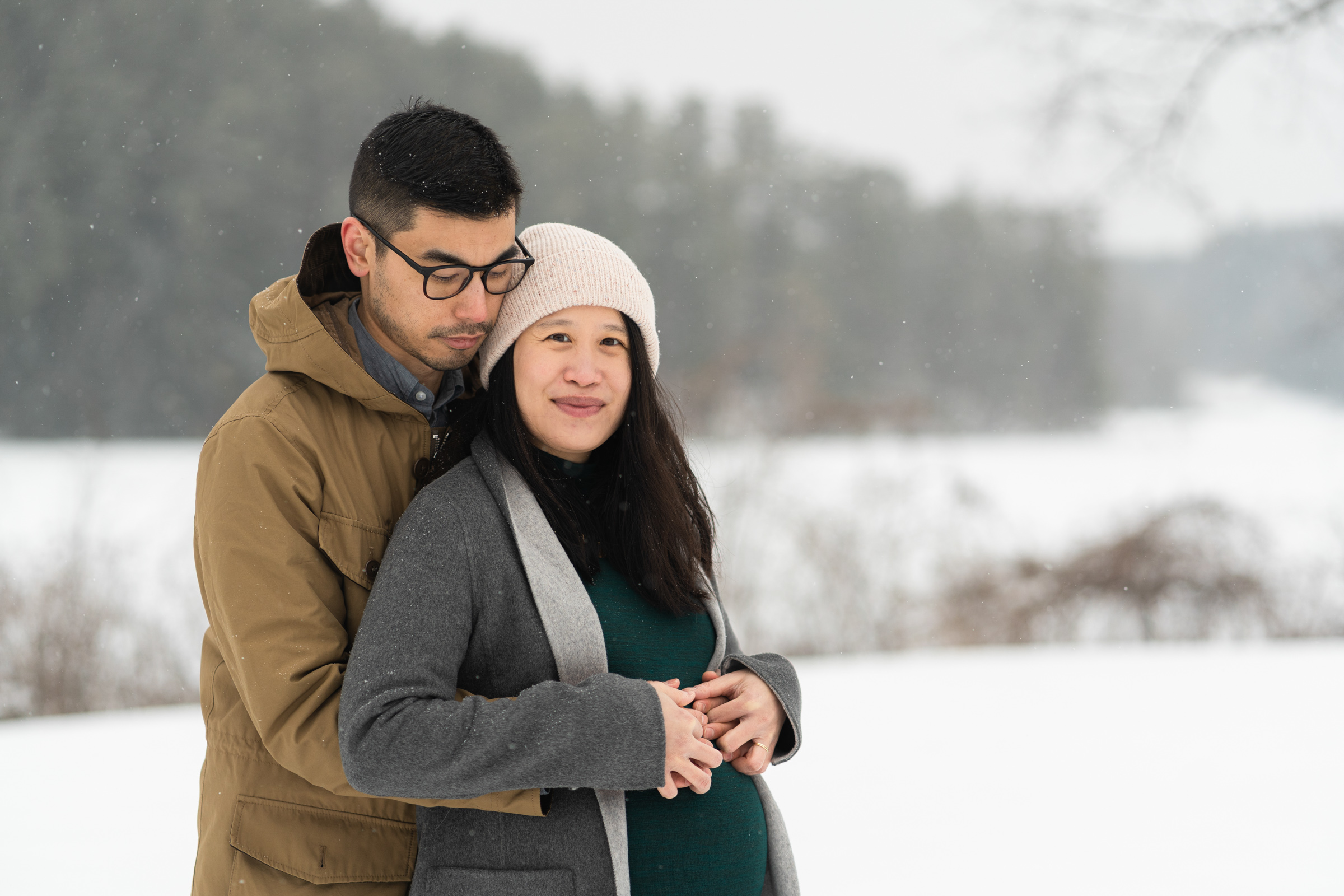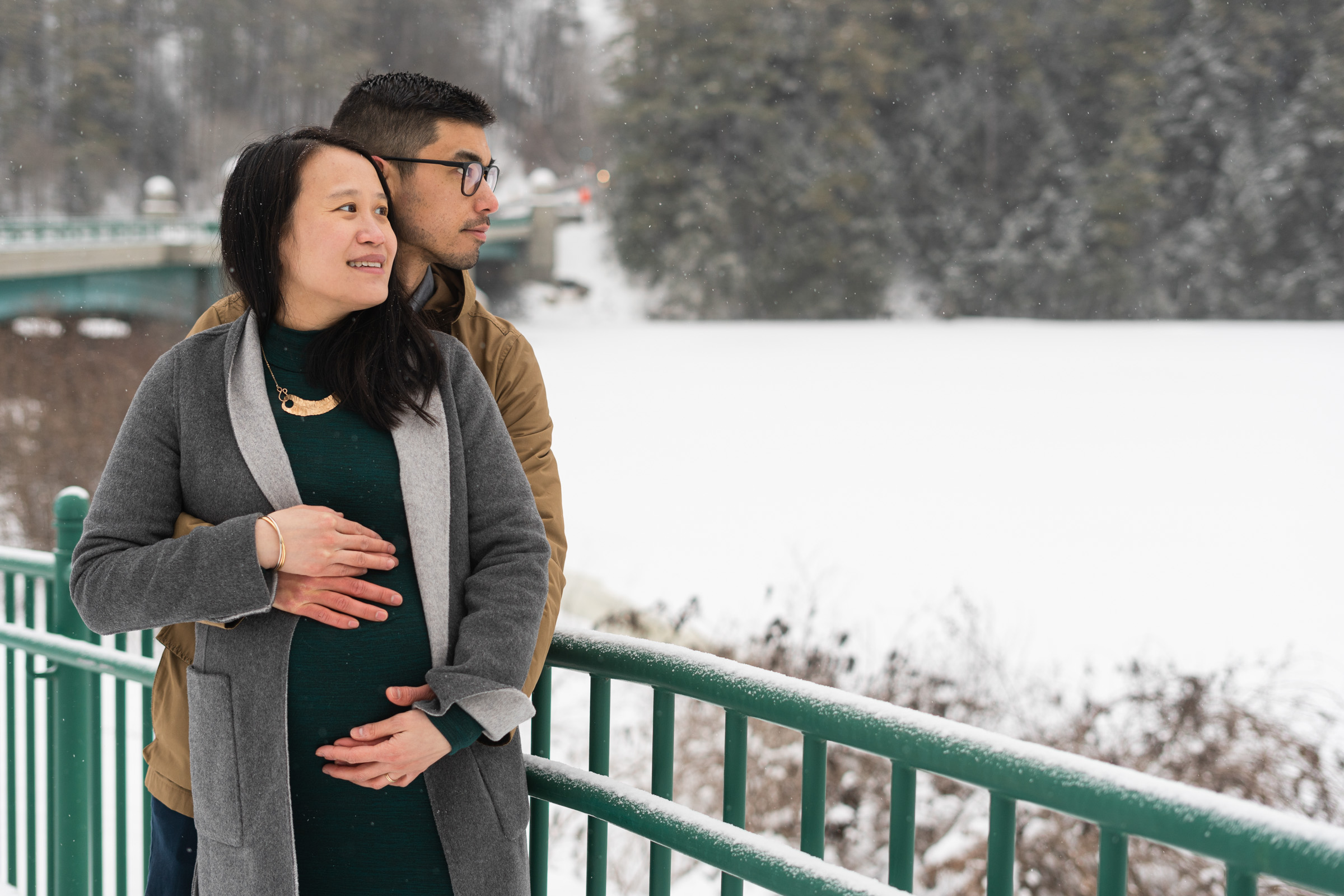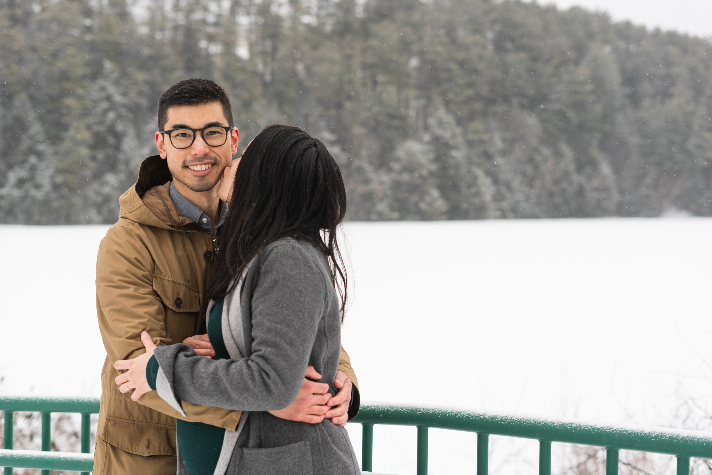 They chose a great style for a winter weather photo session that allowed them to be warm and comfortable by dressing in layers, but also remove jackets for a few photos to show off her maternal shape. Their outfits matched both the season, the New England vibe, and provided enough contrast to stand out agains the white, snowy backdrop.