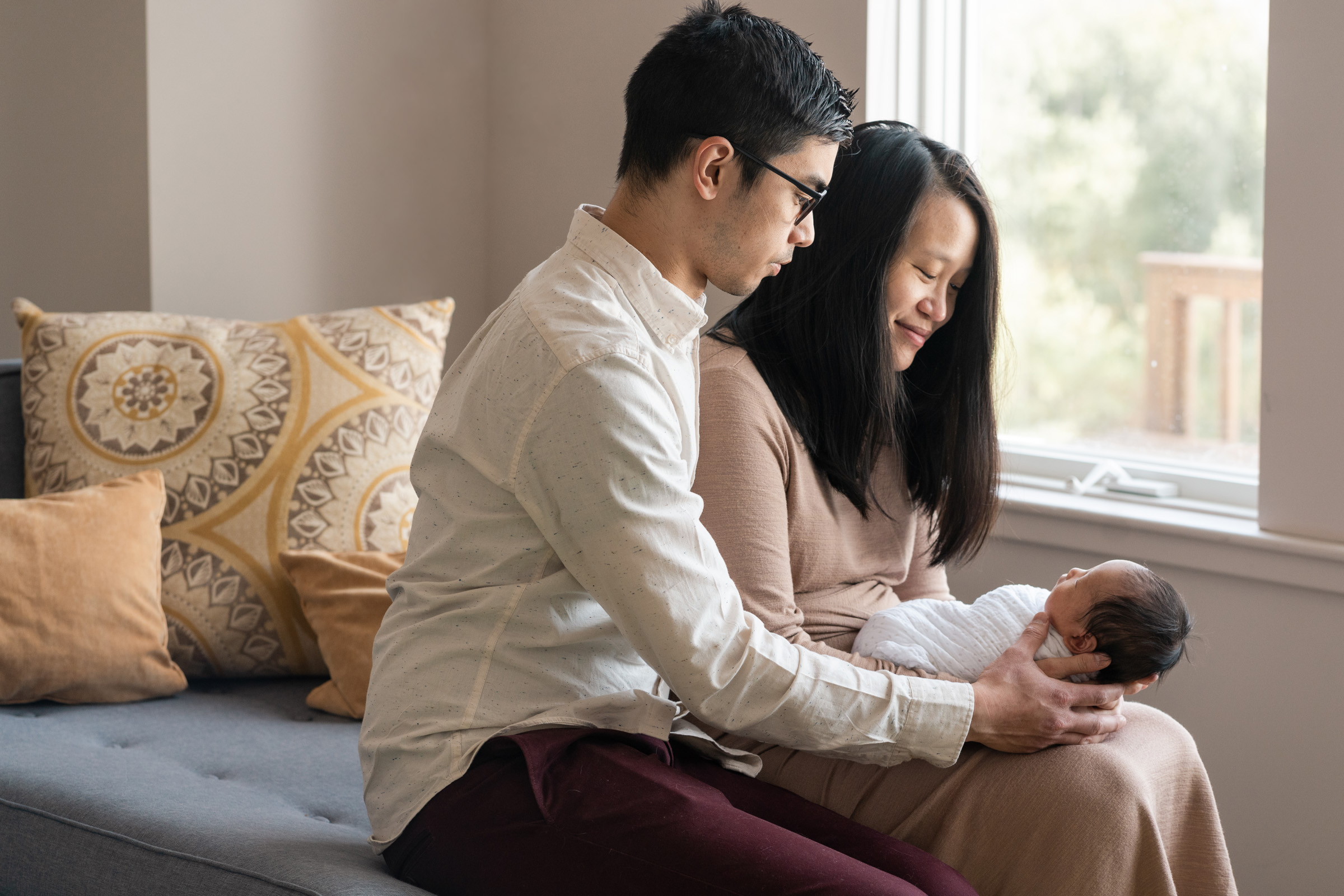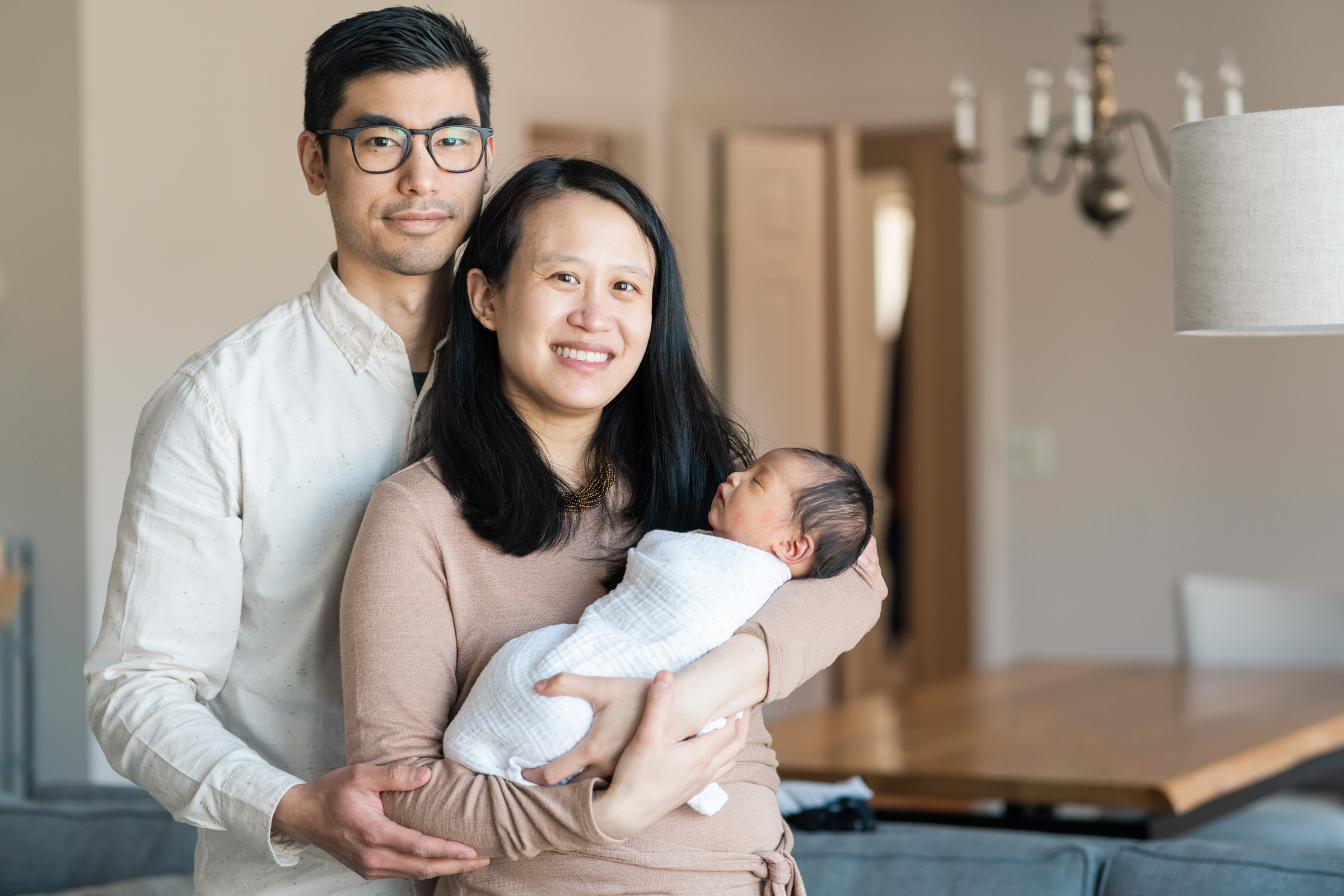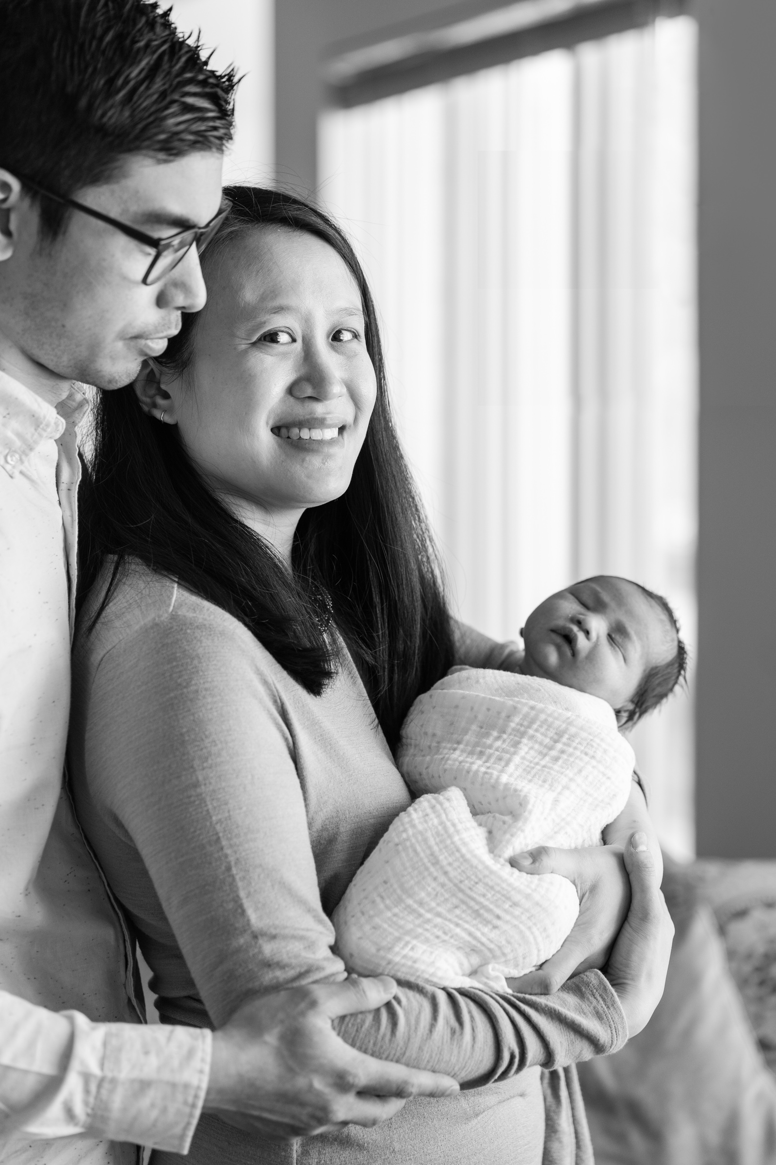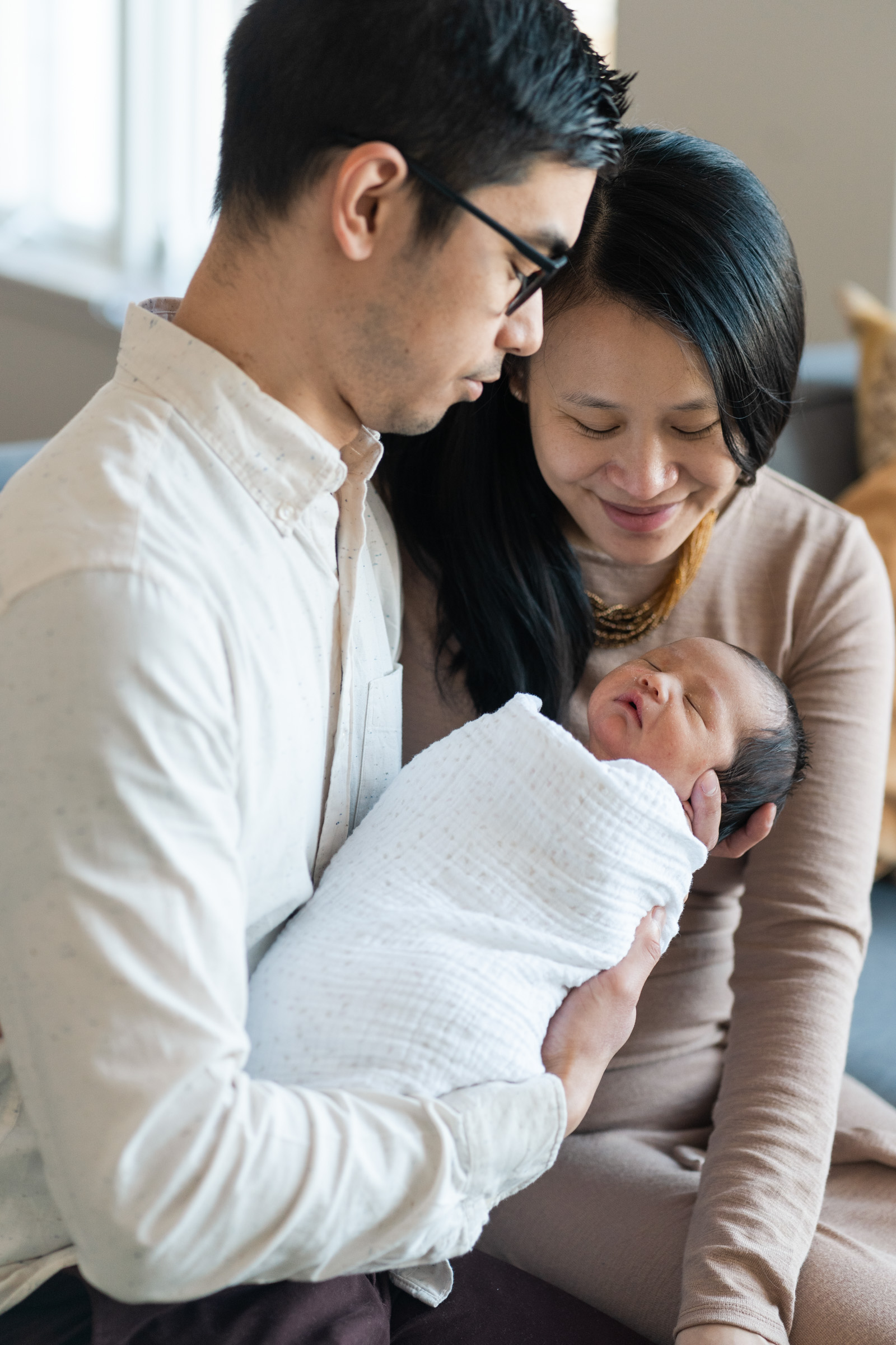 With no rush, and breaks for diaper changes and feedings, we created candid and traditional portraits to capture tiny details and in-between moments of the new family of three. From different perspectives of the newborn alone and cradled in the arms of his parents, I created a variety of photos of the three of them together and the small details of hands and toes.