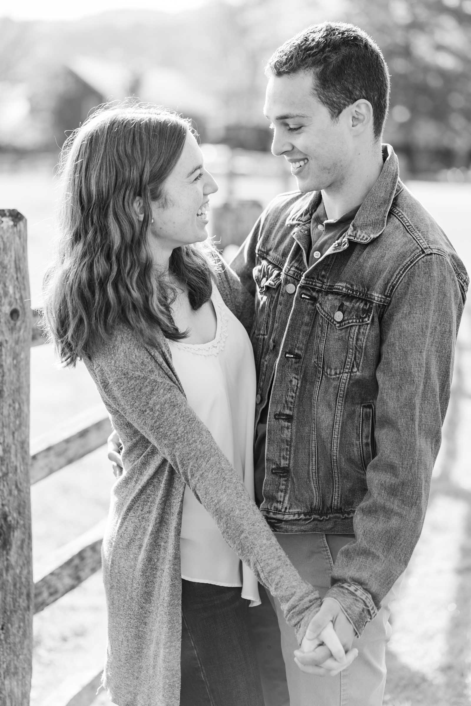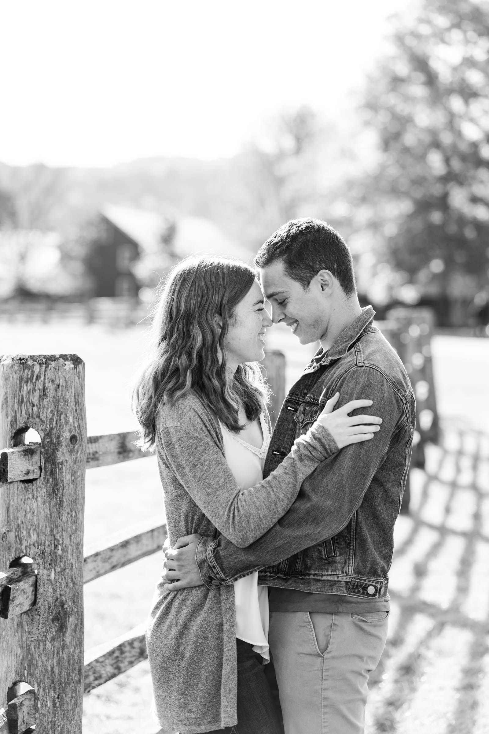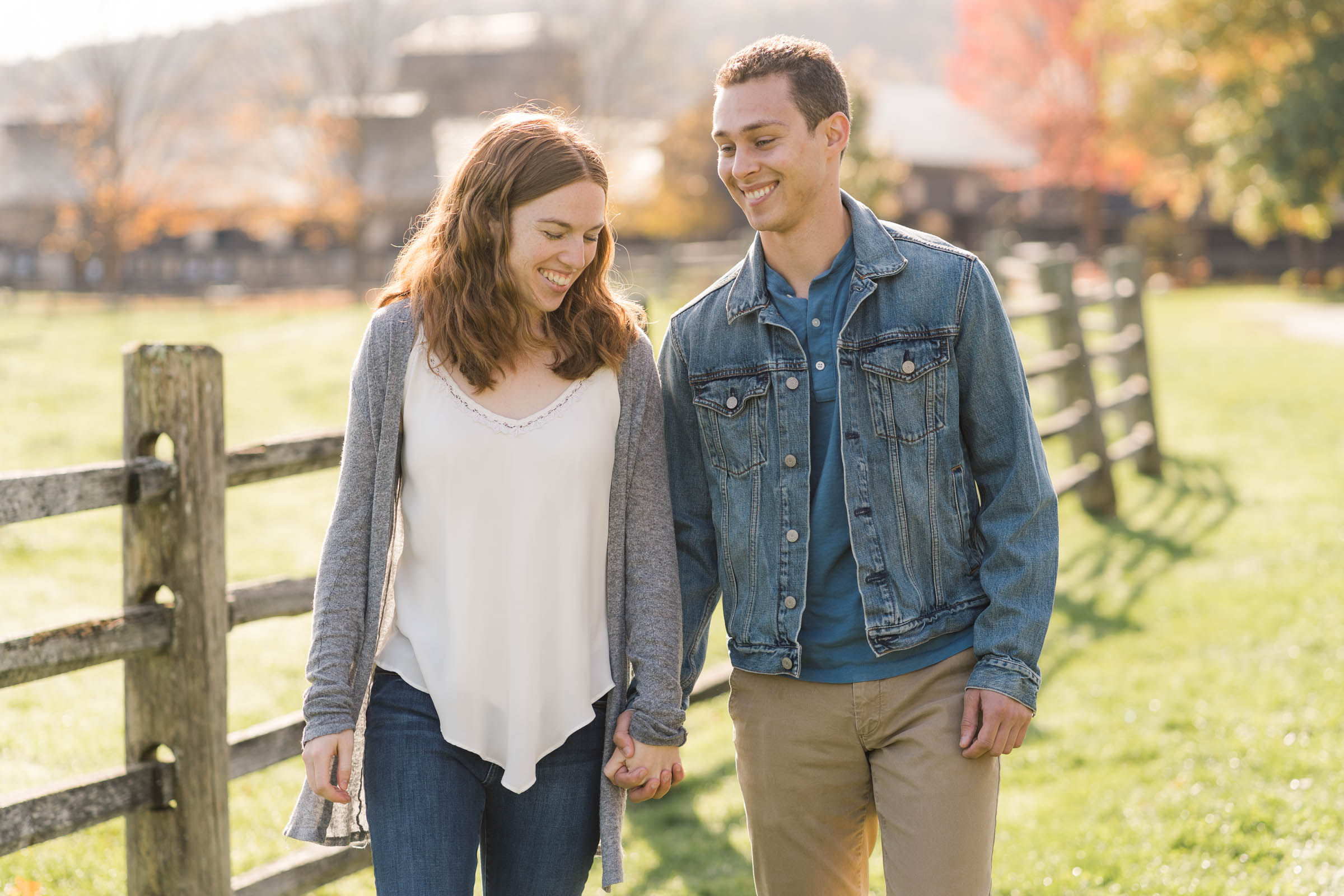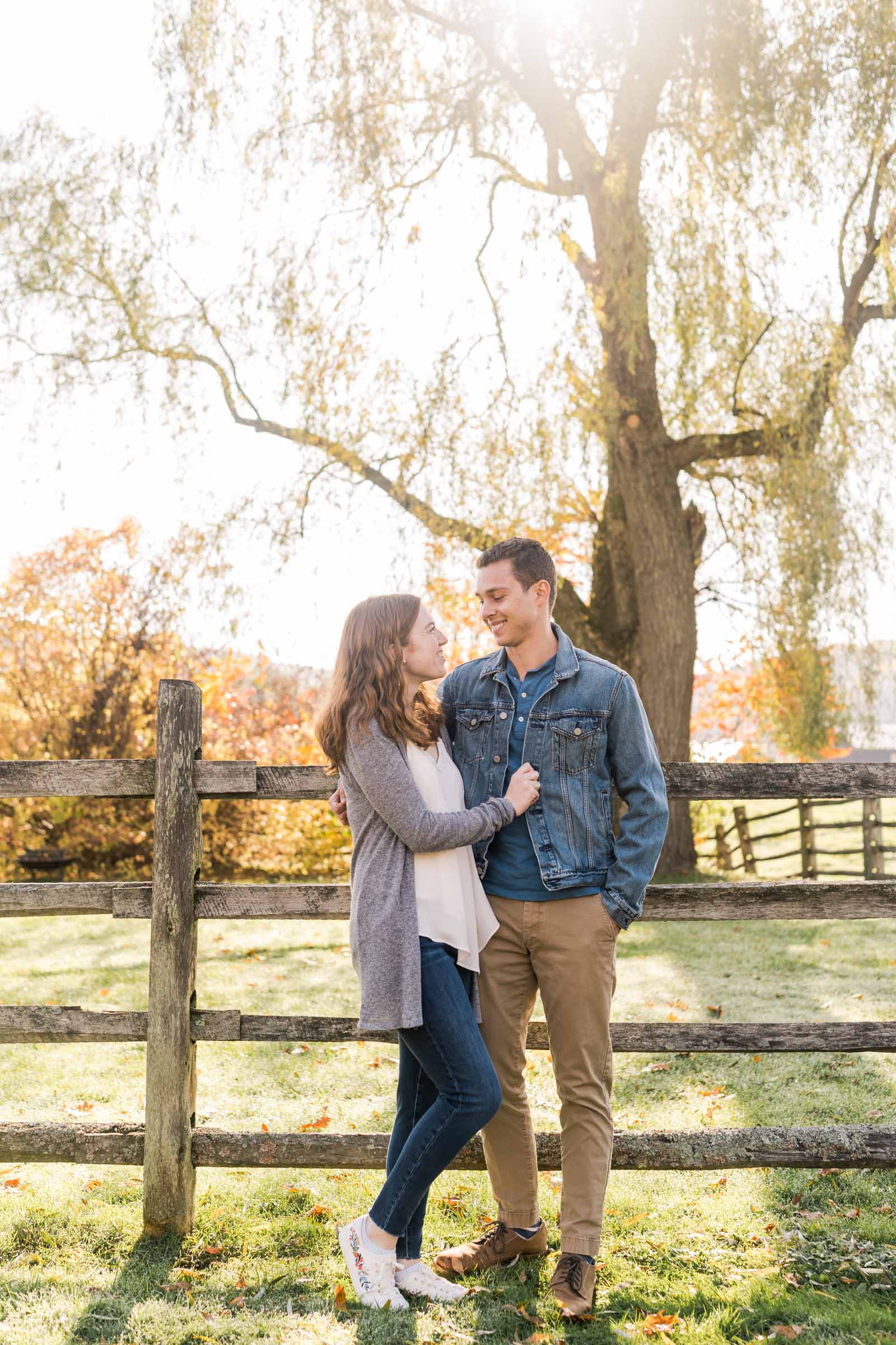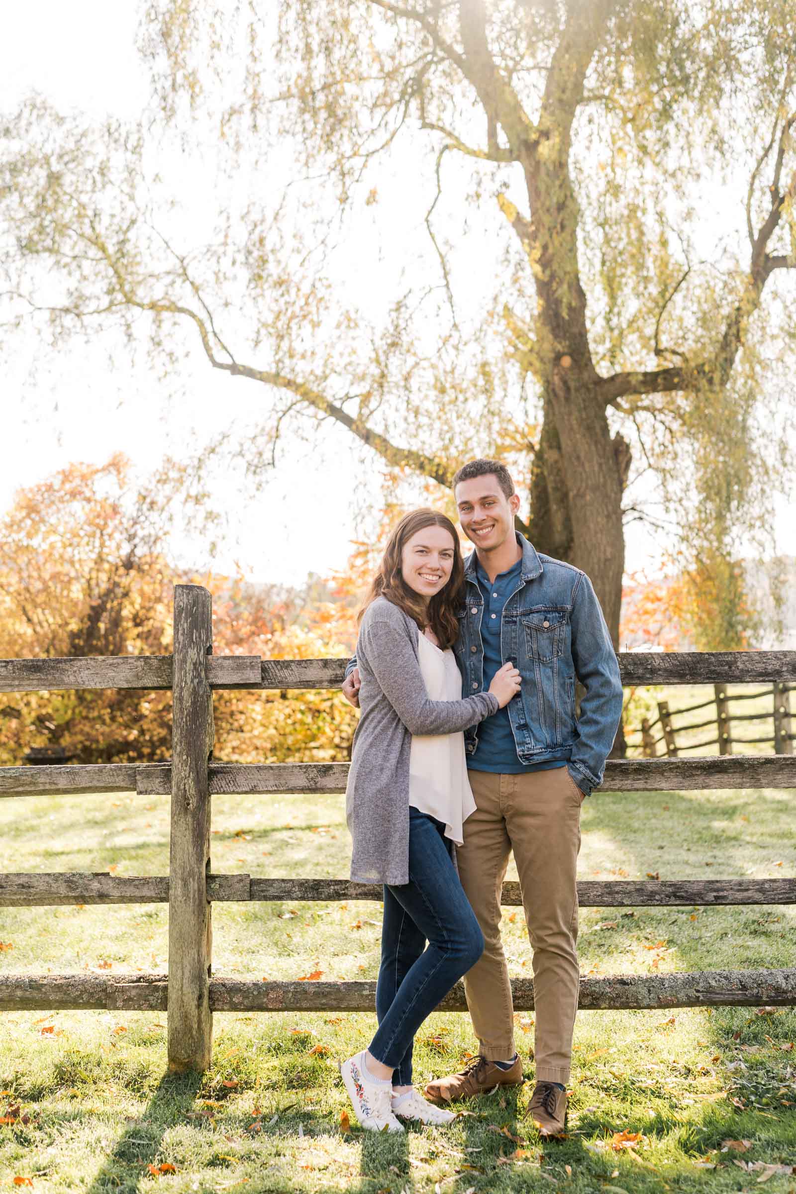 The engagement session began in the morning at Billings Farm and Museum. I love the soft morning light, especially in the fall when there’s no fog, as was the case on this particular golden morning. Our first portraits at Billings Farm were in front of a fence with a weeping willow in the background. The soft light shining through the willow caught my eye as a backdrop for these first images of Chris and Shannon. In sync with a bright and natural style, trees and foliage that gently diffuse the light are key to producing soft, airy images. I’m always excited when I find a willow tree! We continued making a variety of portraits along the fence that borders the farm. I love the depth and leading lines the fence provides. It creates a pleasing composition. Shannon and Chris look so natural and at ease as they cozied-up with each other for these images.